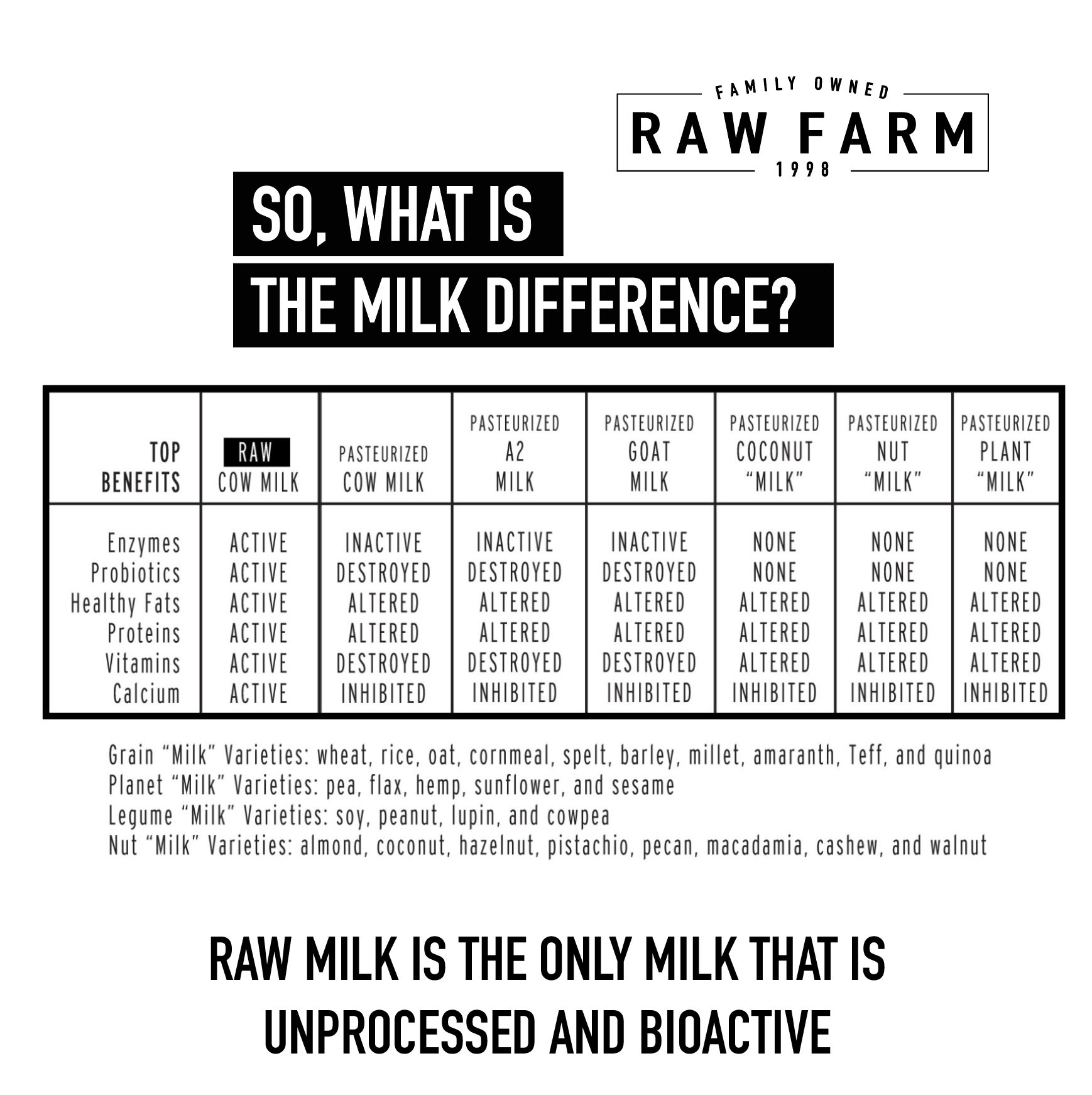 RAW FARM Raw Dairy Products are unprocessed and complete with bioavailable vitamins, minerals, enzymes, beneficial bacteria, naturally occurring CLA, and omega-3 fatty acids. Absolutely NO antibiotics, synthetic hormones, or GMO anything.