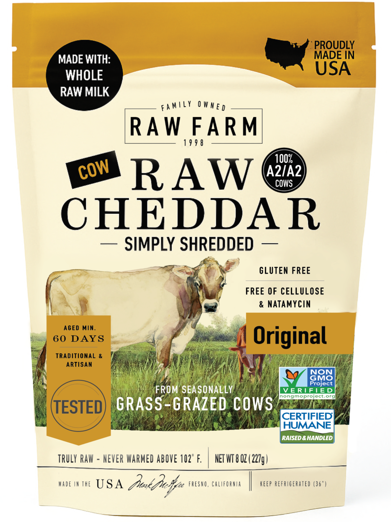 PACKAGING: BAGS MADE WITH NON-TOXIC PLASTIC. BPA/BPS & PHTHALATES FREERAW FARM Cheddar’s yellow color comes naturally from seasonal grass-grazing. Its color will vary with the season; springtime brings the brightest color. Absolutely NO antibiotics, synthetic hormones, or GMOs anything.